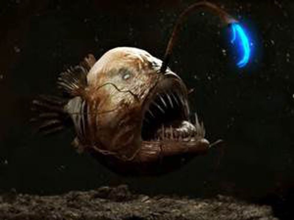 Anglerfish are the scary looking fish in Finding Nemo with the glowing light attached to its head. Female anglerfish are much larger than males. In fact, male anglerfish are 1/20th the size of female anglerfish. Male anglerfish are so small that they attach themselves to the female by burrowing their teeth into the female. When this happens, the male angler fish appears to be nothing more than a small blob attached to his female counterpart. After burying himself into the female, the male anglerfish eventually loses his eyeballs, internal organs, and then life.