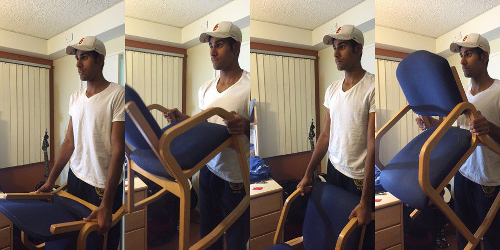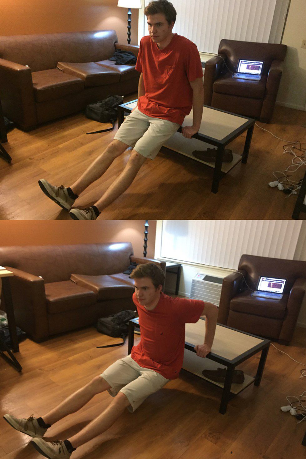 There's a good chance you didn't bring Dumbbells to college, and I don't blame you. Lucky for you though, there's still a good way to get some bicep reps in. Every college in America seems to have come with the same wooden desk and the same weird blue chair. Believe it or not, that chair can make for a decent weight if you know how to use it. The chairs aren't that heavy, but they're an awkward shape which adds some difficulty to it. Holding it with different grips also let you add more of a challenge to your curls if you still find it too easy.Suggested Reps: 4 sets of 8