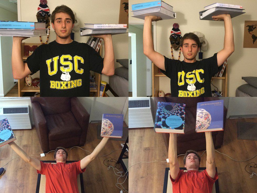 Textbooks are expensive, so you're going to want to get as much use out of them as you can. They're also heavy, so you can use them as improvised weights too. Stack your textbooks and use them to perform a shoulder press or chest fly. You can also load up your backpack and use it as an improvised kettle bell for additional exercises.