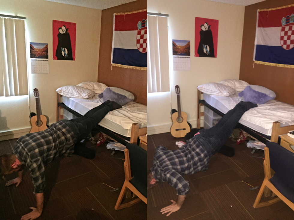 While traditional push-ups only work your lower pecs, decline push-ups work the entire pectoral area. They require someplace elevated for your feet, and it becomes a harder workout depending on how elevated your feet are. Lucky for you, your dorm bed is already ten feet off the floor.