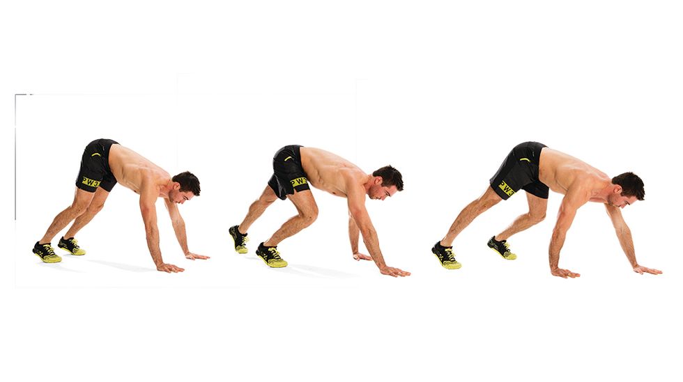 You probably haven't done this since you were in elementary school, but the fitness benefits are worth the nostalgic embarrassment at the gym. Starting on your hands an knees, push up on to your hands and your feet as if you are in a downward dog position, with less of an angle. Alternate walking your feet and moving your hands as though you were a four-legged bear. You should feel this exercise in your arms and shoulders, as well as the stretch of your hamstrings. This exercise is great for getting your heart rate up and serving as a total body experience.