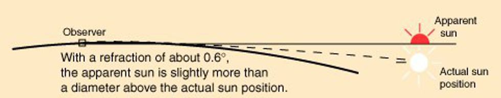 Have you ever been told that some of the stars you are looking at are already dead because of the time it takes the light to travel? Well the same thing sorta happens with the sun, except the sun doesn't die every night. Again thanks to our atmosphere, which bends light, we are able to see the sun setting. If this is a little confusing, please look at the picture below.