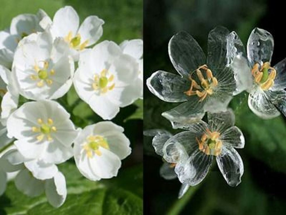 Diphylleia grayi, or the skeleton flower, is native to the Appalachian mountain region in the United States and colder mountain regions of eastern Asia. While on the surface it appears to be like any ordinary plant, the skeleton flower is anything but ordinary. When it rains, the petals of the flower will become transparent and take on a crystal like appearance. Why they didn't name it the crystal flower or glass flower is beyond me but maybe those names have already been claimed. Scientist aren't sure why the flower does this or what benefit it provides but it certainly looks cool.