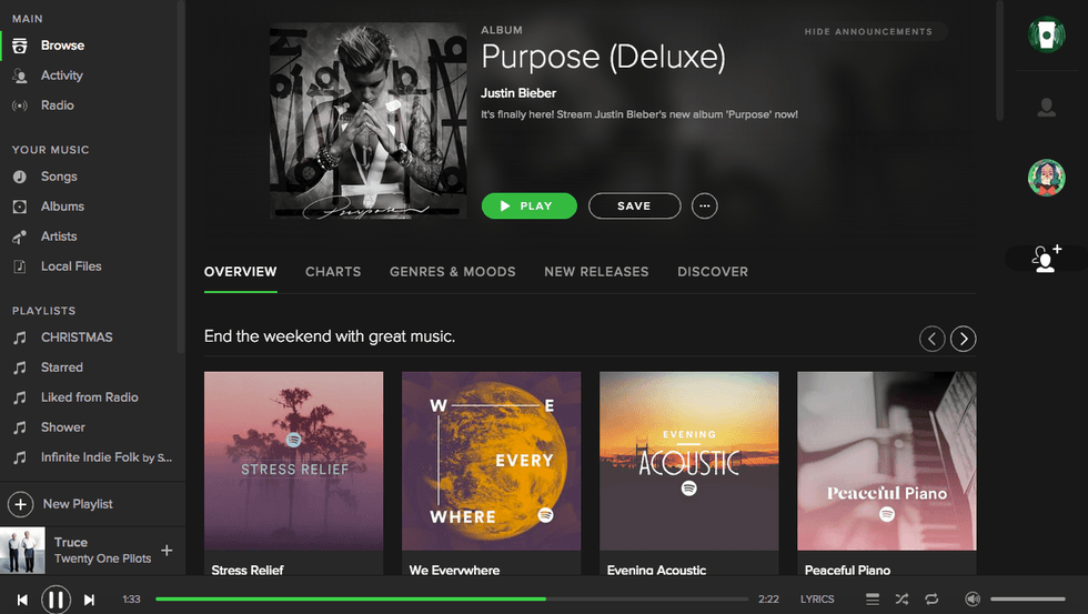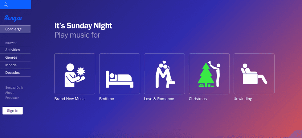 Songza is a great choice for someone who has no idea what they want to listen to. The website offers you common playlist choices tailored upon your interests and the time of day -- at midnight on a Friday, you might be presented with various party playlists, sleeping playlists, or chill-out playlists. It's a great way to discover new music and genres that you haven't considered before.