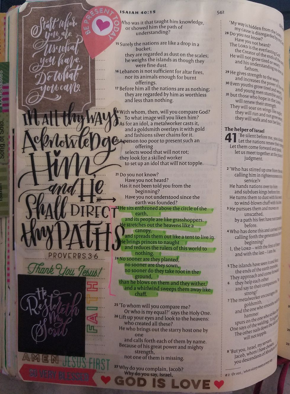 While it may sound silly and almost kid-like, using stickers in your Bible is fun and, believe it or not, creative. There is a wide variety of stickers you could use when making your journal entry, such as letters, puffy, animal, and so on. It’s also nice to find ones that correspond with the chapter you had just read or a verse that sticks out to you. My favorite sticker set is from Create 365’s But First God.