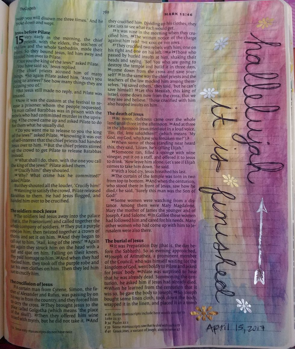 Some people are opposed to using paint in their Bibles, as it will cover the words, keeping you from using the Bible later on. However, watercolor paints are not like acrylic, leaving it easy to read the passage after making your entry. There is so much you could do with watercolors, ranging from painting the side you want to put your notes on, paint the whole page, or paint a simple but mesmerizing design. Channel your inner artist and go crazy. (It’s a good idea to have paper towels nearby to dab the page after applying the paint. It will absorb the extra water, leaving less risk of bleed through.)
