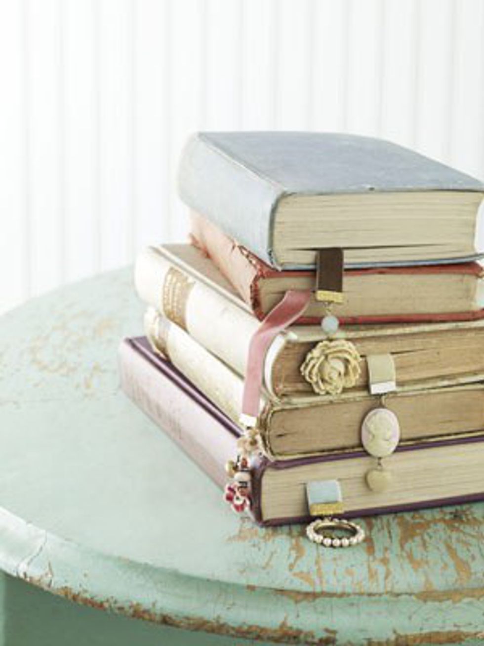 Cut some ribbon into the length of a book, usually about 9 inches. Get some ribbon clamps, which rarely cost more than $2 for a pack of ten. Put the clamps on the end of the ribbon, stick an earring or charm on the clamps, and you've created a cute bookmark for your bookworm friend!