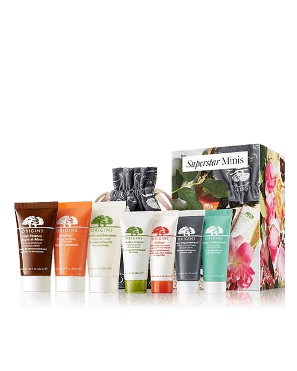 The Origins Superstar Minis set comes in an exclusive cotton pouch and includes a variety of best-selling products from the natural, eco-friendly skincare brand.