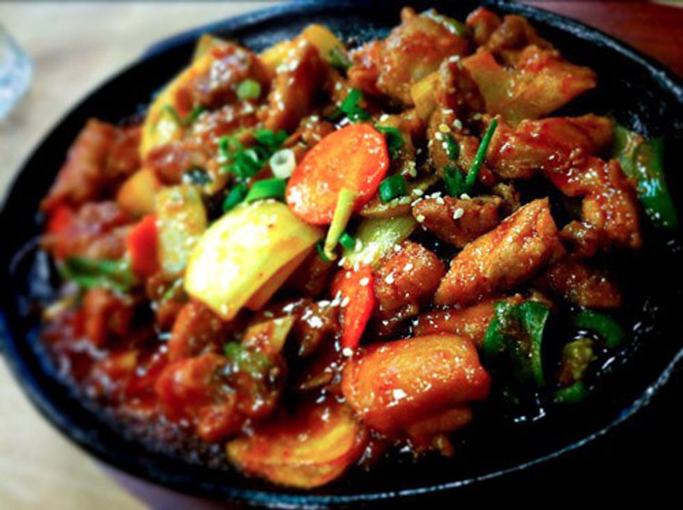 Bulgogi is a delicious dish composed of a protein (usually grilled and marinated beef, but can also be made with chicken or pork), grilled green peppers, and grilled onions/garlic. It is often served with many side dishes, with the most common side dishes including rice or a bed of lettuce.