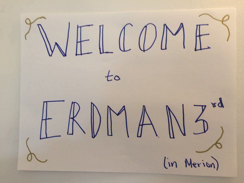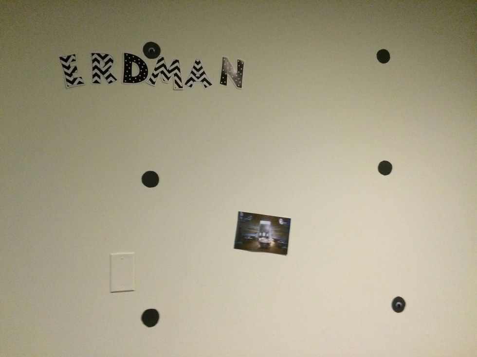 HA Abbey thought it would be really funny if the theme was another dorm. Since Erdman had the most recognizable aesthetic, she and her customspeople dug in, making the charactaristic Erdman wall holes out of paper, and hanging up pictures of Erdman chairs, and Louis Kahn, Erdman's architect. There are even some sparkly black bugs on the wall, in a clever nod to Erdman's cockroach problem. The nametags on the door feature Erdman's distinctive blueprint.