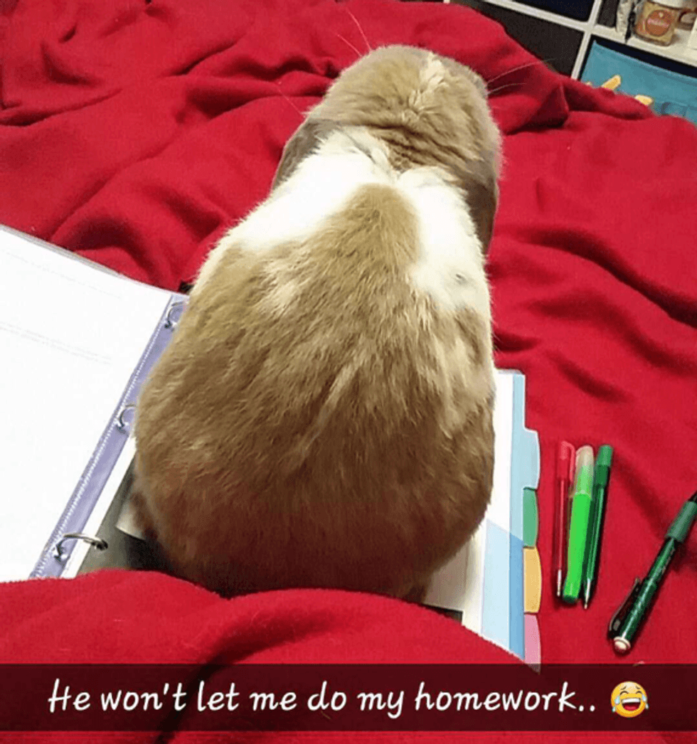 Similar to lap dogs, rabbits will tend to want to be the center of attention and want physical interaction. This can be a problem if you are trying to finish your homework because your rabbit will undoubtedly realize the sudden lack of attention and sit on your homework. Picture provided as proof.