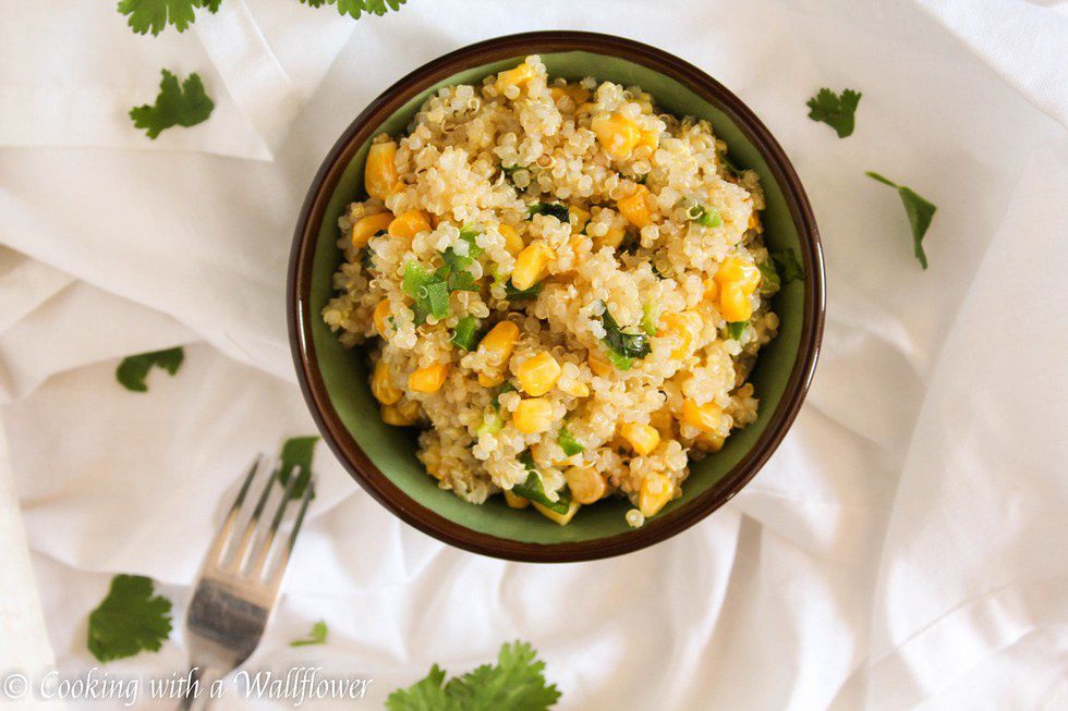 - Once the quinoa is finished, add the corn and sautƩed onion and soy sauce