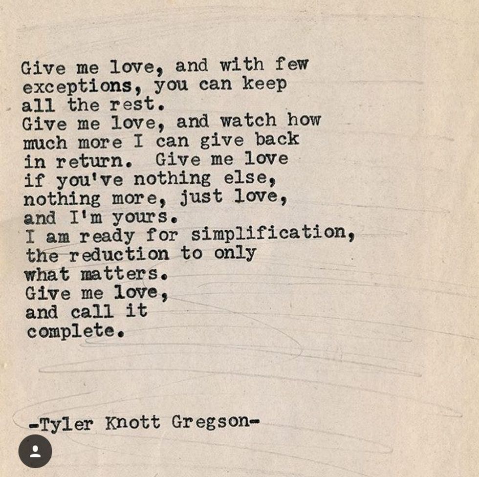 I discovered Tyler Knott Gregson a couple years ago while I was scrolling through Pinterest and he quickly became one of my favorites. He has a series called the "Typewriter Series" that most of his poems come from. He also has a wonderful book called "Chasers of the Light." In the meantime though follow his Instagram, because apart from being an amazing poet he’s also a great photographer.