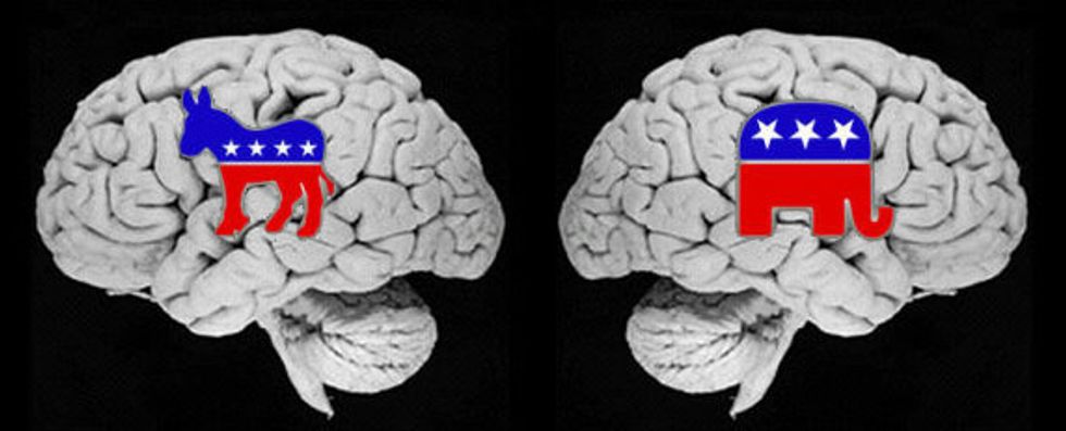 (Kanai et al. 2011) They used fMRIs to see what part of the brain lit up when people were asked political questions. They found that in liberals the portion of the brain responsible for tolerance to uncertainty lit up most frequently, while the portion of the brain responsible for fear lit up for conservatives. Now they only studied people with strong political beliefs, but isn't it interesting? How people process controversial topics may affect their political affiliation!