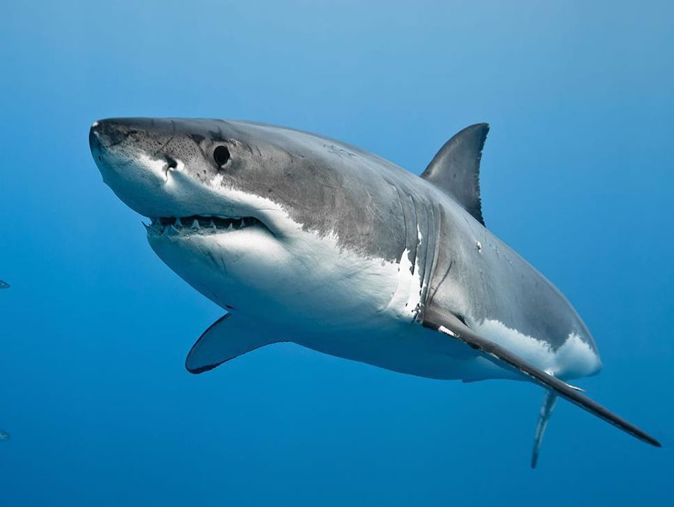 The great white shark, also known simply as a great white is a large shark which can be found in the coastal surface water of all major oceans. Great whites average about 15 feet long but can often grow up to 20 feet long, they also weigh in at around 5,000 pounds. They are top of the food chain and have few threats in the ocean. Great weights are also usually born in litters of two to nine! They are also on the verge of being marked as endangered due to overfishing.