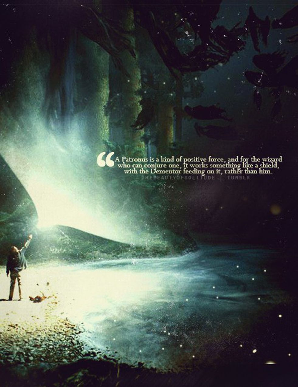 Happy thoughts are continually referred to as a source of power and light in the books. A boggart, which was a creature that could turn into one’s worst fear, could be defeated with laughter; showing it that it doesn't control you nor do your fears. To successfully use a Patronus charm, the charm one conjures to fight a Dementor, that person must bring their happiest memories to the forefront of their minds. It makes the spell especially difficult to cast because you must think of and draw from your happiest memories in a time where they are literally being sucked from you.