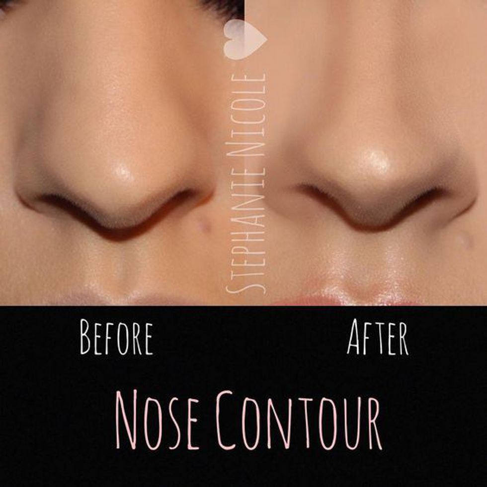 Nose contour may seem trivial, but it really does make a difference. By applying dark contour powder or cream to the sides of your nose, blending up to the brow, and a light cream or shimmer powder to the slope and tip of the nose, you can create the illusion that your nose is either slimmer or wider than it actually is. Because the nose is in the middle of the face, it can easily add or take away from your overall makeup look depending on how and if you contour it.