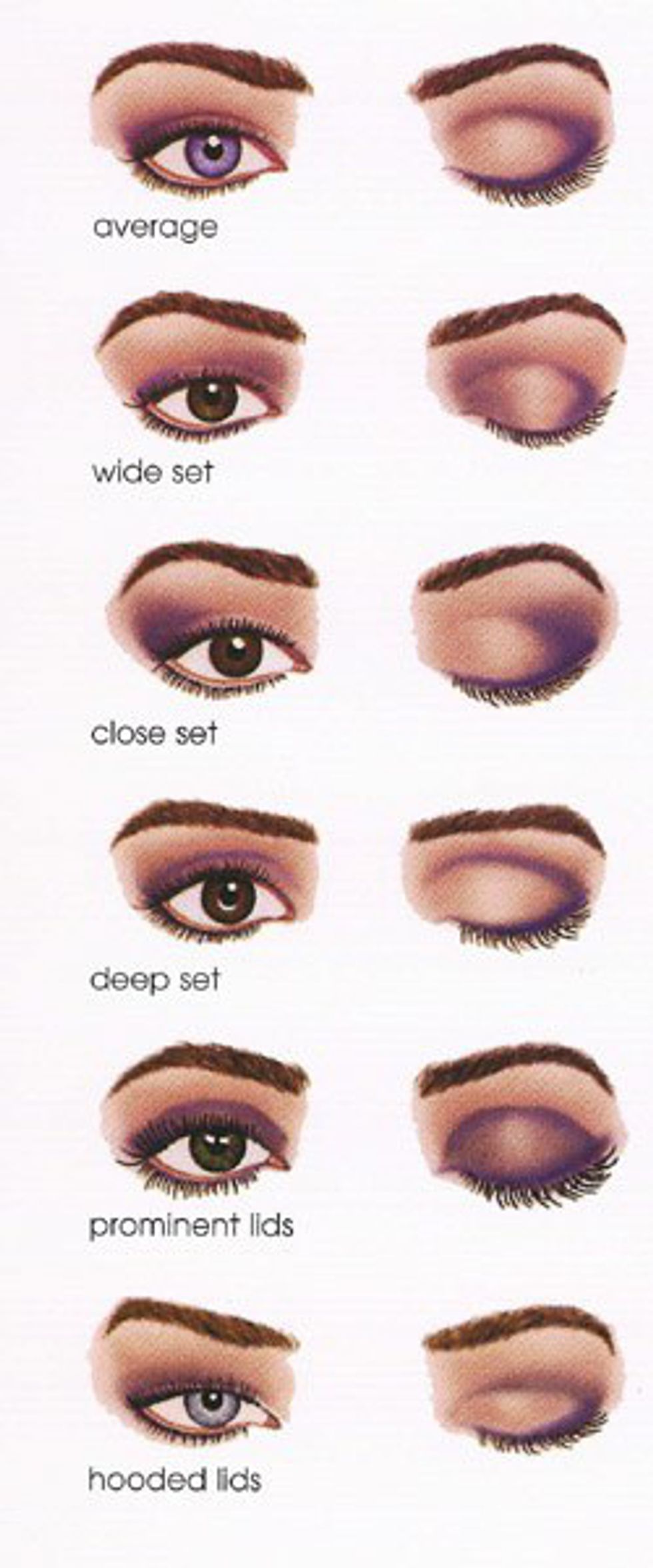 The eyes are the most prominent part of any makeup look. Applying eyeshadow and eyeliner in a way that compliments your eye shape can greatly alter how big your eyes look and whether you look awake or tired. It's helpful to use an eye shape chart to figure out what your eye shape is and what type of eye makeup would work best for you.