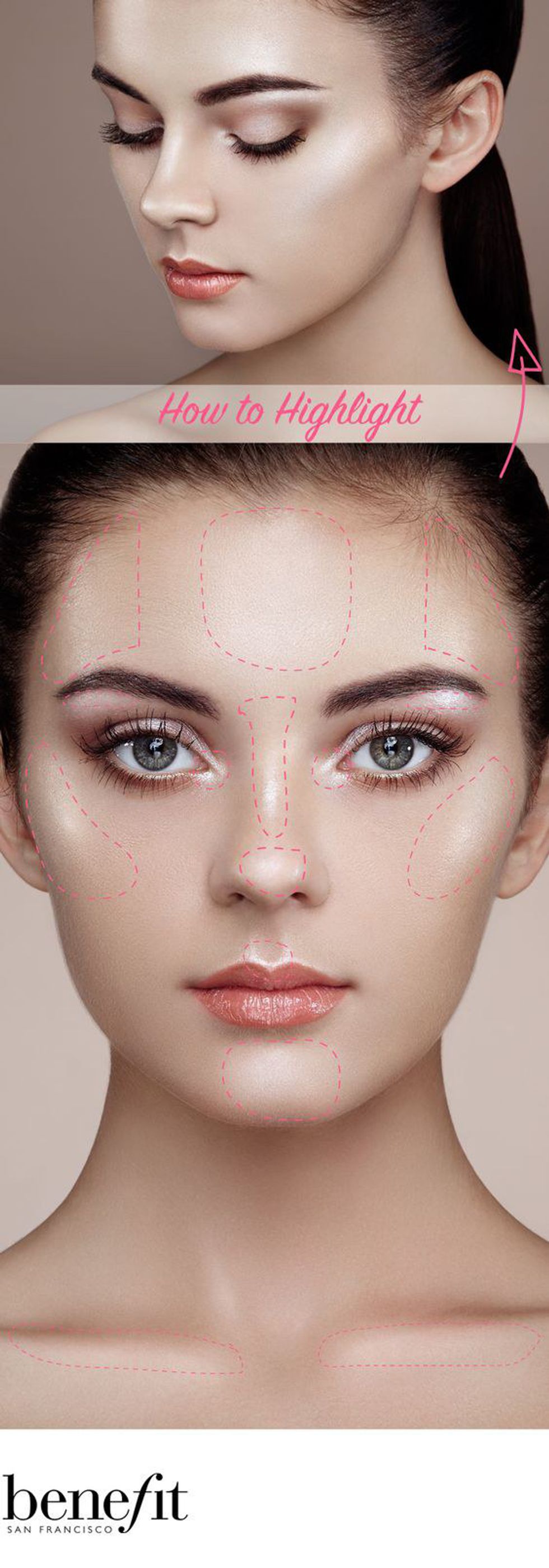 Highlighter is a wonderful extra touch used to frame your face and capture the light. When applied correctly, highlighter will make your face glow and show off your cheekbones. When using highlighter, apply it to your forehead, tip of the nose, chin, and cheekbones. For a super shimmery highlighter, be careful where you apply it. I would stay away from applying heavily shimmered and pigmented highlighter to large areas of the face, such as the forehead, and confine it to only the cheekbones.