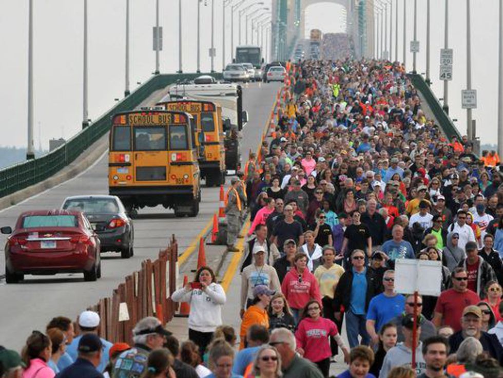 Starting in 1968, only a year after the completion of the project, then Governor G. Mennen Williams led 68 others in a walk across the bridge during its opening ceremonies in late June. However, the walk date was changed to Labor Day the following year so more people could take part in the festivities. For the following 6 years the walk across the Bridge alternated starting points, but ever since then the walkers start in St. Ignace. Upon completion of the event, the walkers then take buses and shuttle back to the Upper Peninsula.