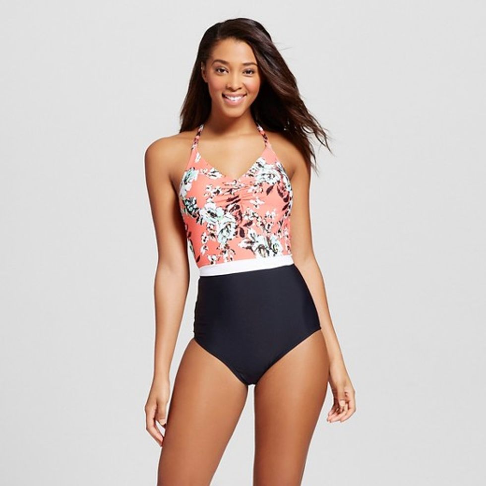 Finally, a halter suit that doesn't reveal tons of cleavage or dip low in the back. Target is by far the best retailer for modest one piece swimwear. This high waist style's white belt and black bottom slim your figure. The floral top compliments the solid bottom. This style suits curvy figures and those with dark hair well.