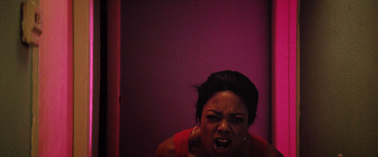 This shot is one of the most visually striking in the movie, partially for the way the music drowns out Paula's scream and partially for the specific way it is shot. It takes place in the first chapter, which is created almost entirely from young, bright blues and greens. When she slowly stalks from her room in red, bathed in pink light, it's jarring, especially in contrast to the shot of Chiron standing in the dull kitchen staring beyond the camera. The shot is set up so that Paula is framed by the walls of the room Chiron and the camera stand in, slightly off-center and bending nearly out of the frame to look directly into the camera, placing you in Chiron's place. The pink and red press in on her rather than filling any space in the kitchen, giving that light entirely to Paula's emotion and mental state. Each time this still shot comes back throughout the movie, that image of Paula leaning into the kitchen, through the barrier of the green walls and down to our level before shutting the door and drowning out the pink light feels angry and unsettling because of the way the shot frames her.