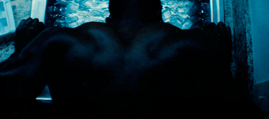 This moment is our first glimpse of Chiron in the movie's third act, and acts as a direct parallel to the last time we were given a shot of Chiron with his head in the ice. The last shot, though, was accompanied by flickering lights and an ugly green coloring. This one is entirely steady and completely colored by a dense, heavy blue. So much of "Moonlight" is filled with moving shots focused on Chiron's back, from the first shot of him running through the grass to the last shot of him standing by the ocean, always following him through his life, but this one is level and stationary, from its lighting to its camera movement, panning ever so slightly up on his back so you can see the muscles flex blue, calling back the image Juan painted at the beginning: "In moonlight, black boys look blue." It's a shot focused on reminding the audience of every aspect of Chiron's past as we enter the final act as well as telling them what to expect of where Chiron is in life at that moment, all through the color, camera placement, and movement.