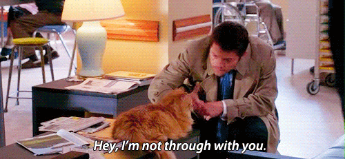 Castiel the angel decided he wanted to be a hunter like Sam and Dean. Well, while in a nursing home, Dean finds out from an elderly lady that Bob the cat talks so Cas tells Dean that he's going to go interrogate the cat. I always laugh at this scene because of the raw emotion Castiel shows towards the cat.