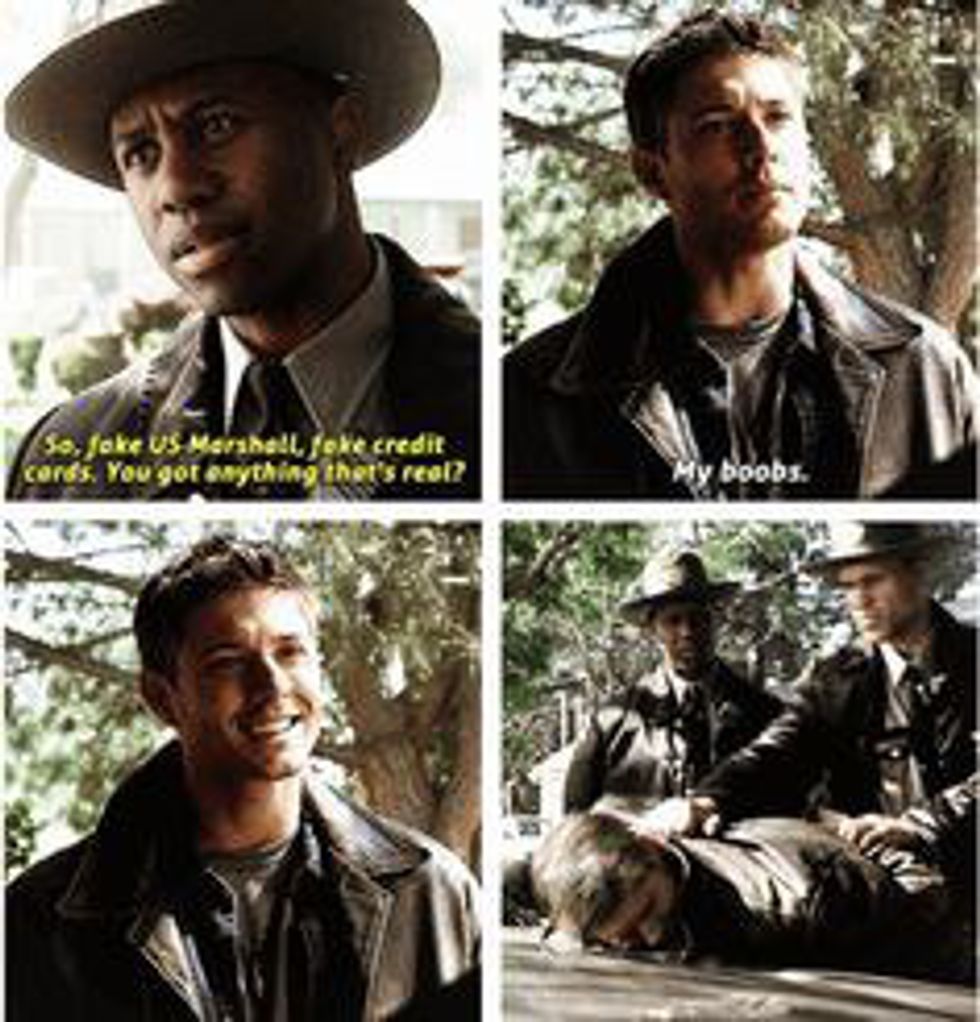 In the first episode of "Supernatural," Dean goes to his brother Sam so they can find their dad. While in the middle of searching for their dad, Dean gets busted for fake IDs and credit cards by the Sheriff of the town in which their father is rumored to be. The sheriff asks if anything of Dean's is real and Dean comes back with, "My boobs." The look on Dean's face after he says it is priceless, which makes it so unforgettable.