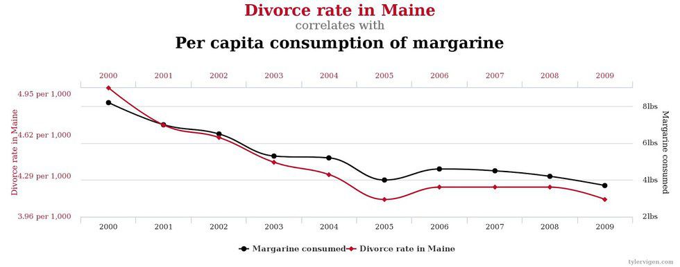 The two are: Positively Correlated so… More Margarine=More Divorce