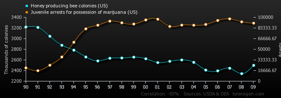 The two are: Negatively Correlated so… More Bee Colonies=Fewer Juvenile Arrests for Marijuana