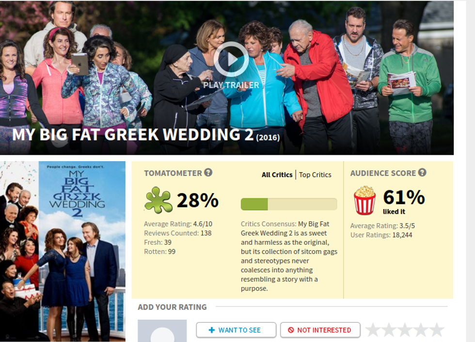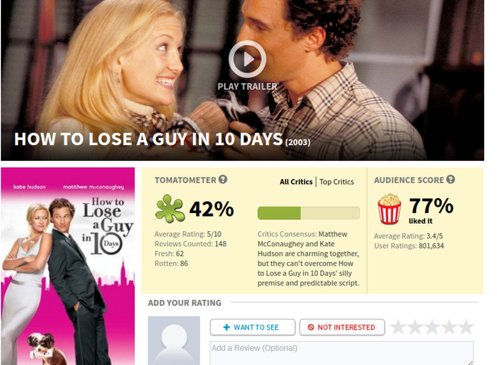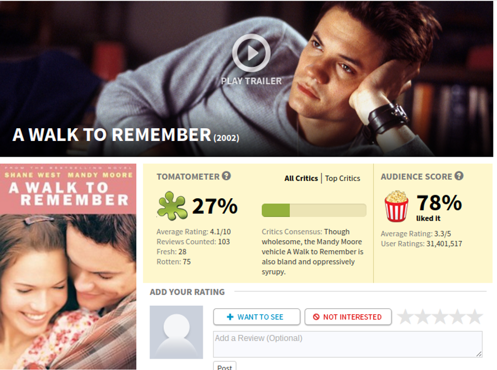 As you can see, most of these are rom-coms or something of the sort. I think my biggest disagreement with critic scores is that they seem to be looking for a certain quality in these films that might just not be meant to be there. Films like these are like those bubblegum pop songs that are just so bad in lyric quality but you can't stop singing them. They follow the same formula, and nothing is "life-changing" about it, but I think that's kind of the point. Not every movie has to be life altering or of Oscar-winning quality. Complex doesn't always mean better. Sometimes just a nice, simple movie that gets the tears flowing or laughs out of you is good enough to be enjoyable. Doesn't mean they deserve "rotten" scores. This is just my opinion, but I'm not alone on it.