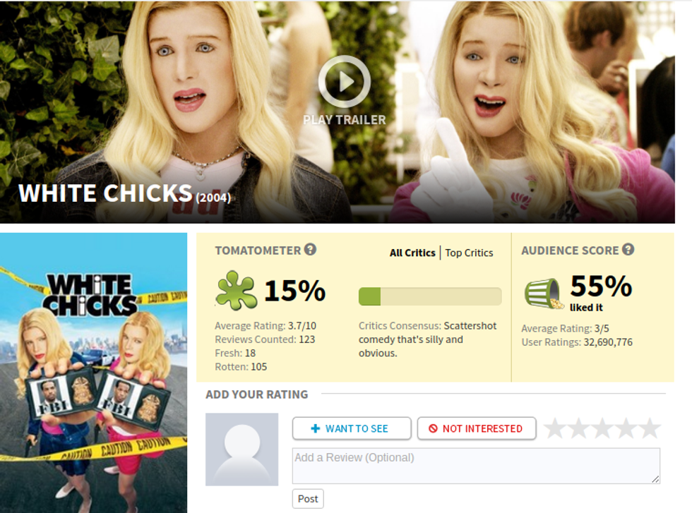 It's summer and I've spent a fair amount of my time watching movies, whether it be through Netflix, DVDs I own, or at the actual theater. I'm not sure how many people do this, but I'm the type of person who IMDb's basically every movie I watch, and read the critic reviews, their ratings, etc. I also often disagree with their ratings, particularly when they give a bad score to a movie I thought was rather good. Maybe I just like bad movies, but that's just my personal opinion. Here are some movies that received bad ratings from critics, but good reviews from the audience.