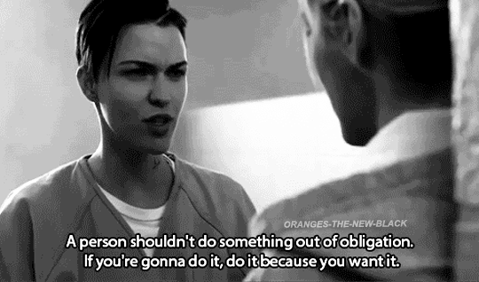"A person shouldn't do something out of obligation. If you're gonna do it, do it because you want it." This quote comes from Stella Carlin who appeared in season 3. This quote stood out to me greatly because of its simplicity. It really is true. People in this world need to learn to do things because they want to do them. Not because they have to do them.
