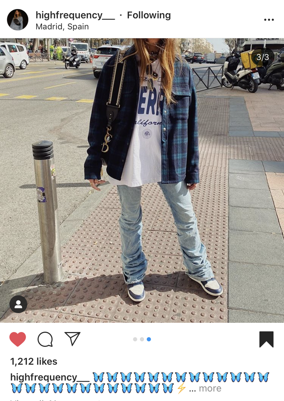 I love this look because it evokes the simplicity that comes with a pair of jeans and a t-shirt, yet is elevated by the effortless coolness of the oversized plaid jacket. The ruched effect of the jeans adds an extra oomph while the Air Jordans tie the whole outfit together. Not to mention the blue/green/white color palette is ridiculously cool.