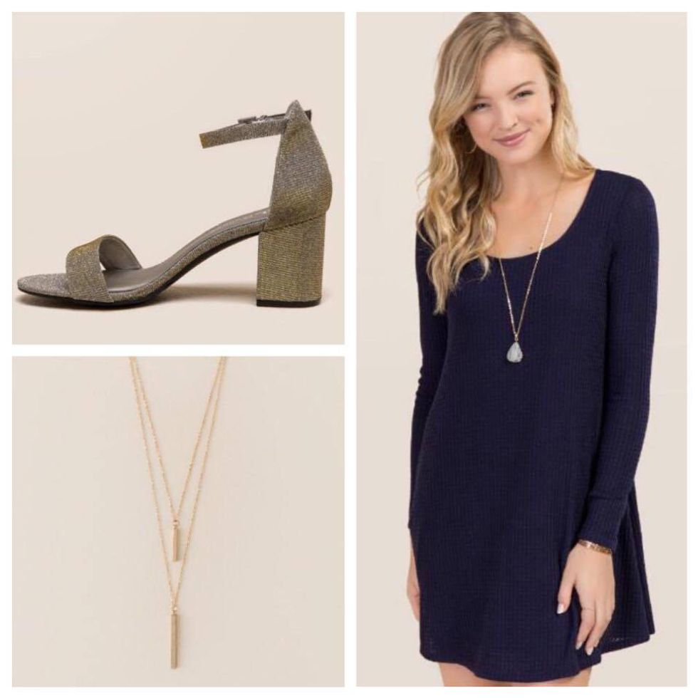 I call this "Blue Christmas" mainly because it's a navy blue dress, but also because I think people always think of holiday clothes consisting of reds, dark greens or blacks. But navy blue gets in there too! Wearing a nice long gold layered necklace, or even a pendant necklace like the girl in the picture, is a great way of making a statement, but keeping it simple. Adding a glitzy short heel adds a little more glamour, but it's not overpowering the simplicity of entire outfit either. May I note that simple long sleeved shift dresses can be easily worn any other time of year too, so if you plan on wearing the dress multiple times, I'd suggest this style.