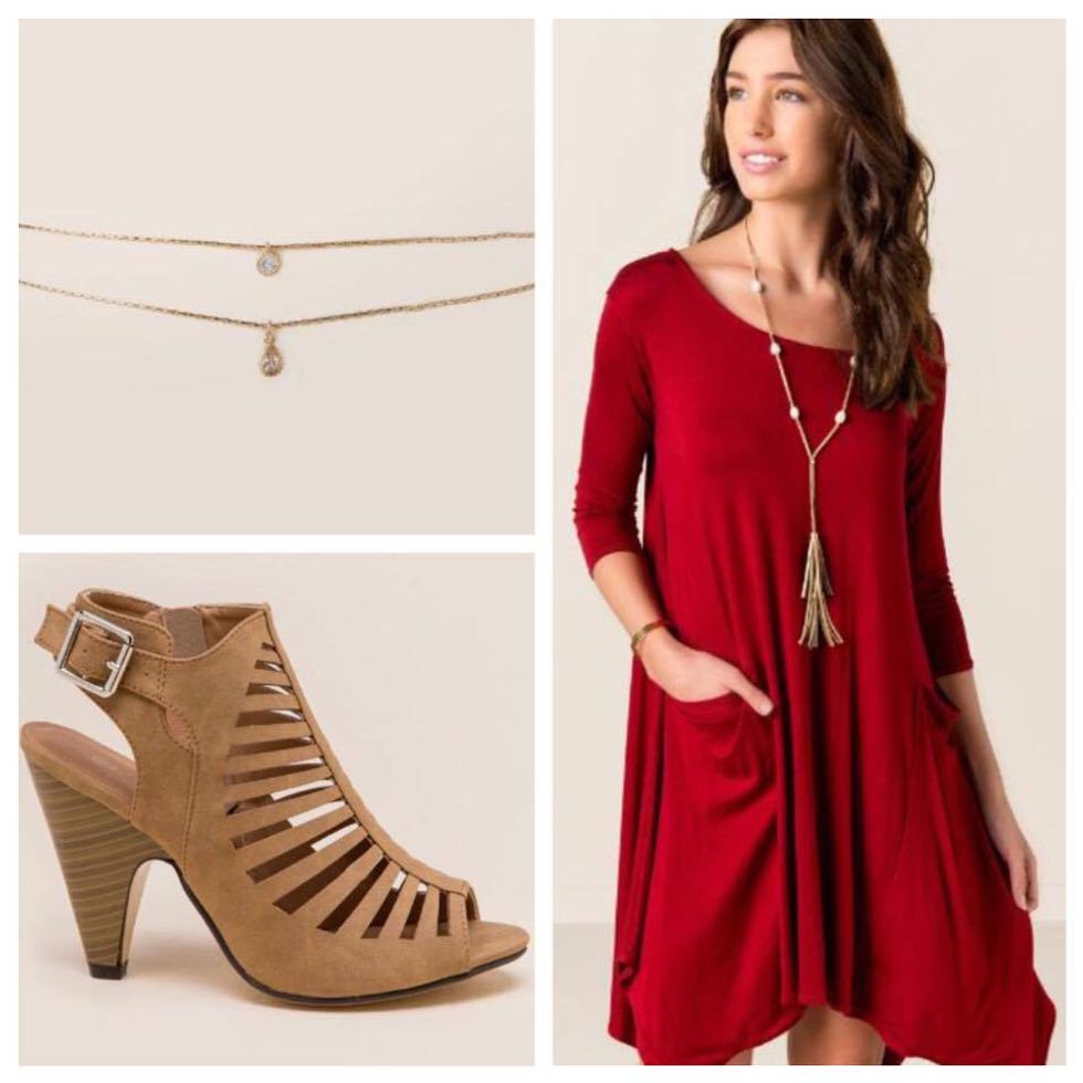 Santa's gonna want to hurry down the chimney tonight if he sees you in this outfit. A long sleeved red shift dress with a chestnut heel and a simple choker necklace is one way of making a statement, but keeping it simple! A red shift dress can be dressed up or down, so you can wear it more than once!