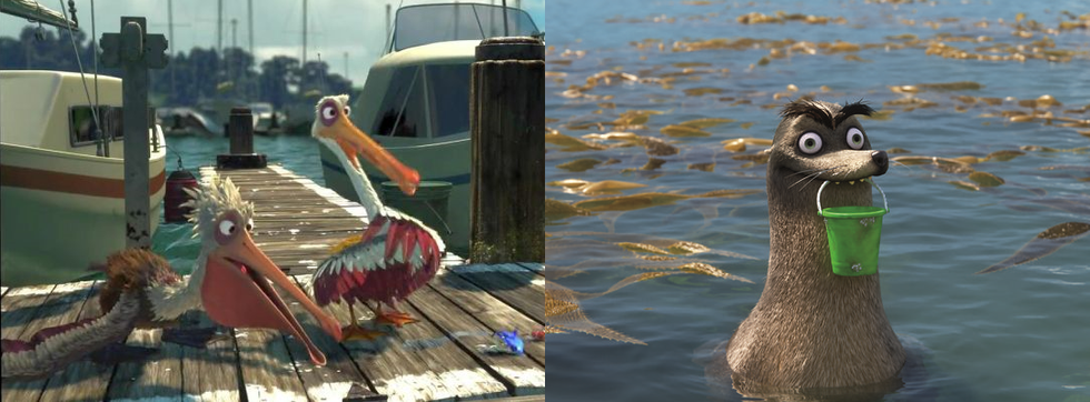 Both films feature characters named Gerald who are seemingly supplemental characters but are actually instrumental to both rescue adventures. In Finding Nemo, Gerald is the hungry pelican who attempts to eat Marlin and Dory for breakfast and forces Nigel to come help him, ultimately uniting Marlin and Nigel for the first time so they can work together to find Nemo. The Gerald in Finding Dory, however, is a frazzled sea lion with a pail and a unibrow. Marlin and Nemo end up using Gerald’s pail as their chariot to fly to Dory’s rescue.