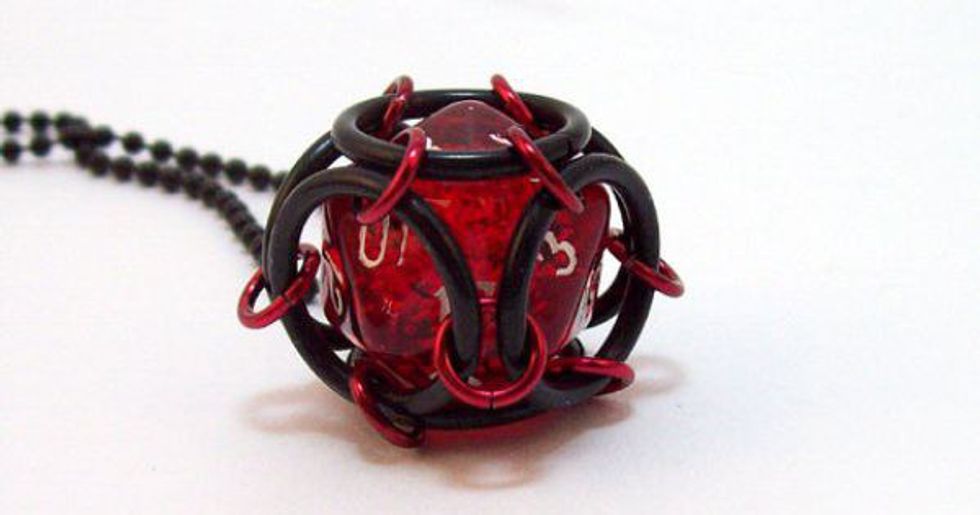 I have recently been trying to learn more about this game. This game is usually played in a group where characters go on a quest together and a Dungeon Master leads them through an unexpected world. This game uses dice to determine where you go, how great you fight, and what happens next. It is one of the most popular role-playing games out there. It can now be played online! The gift I would buy is the awesome dice in the cage above! It can be worn as a necklace or made into a key ring.