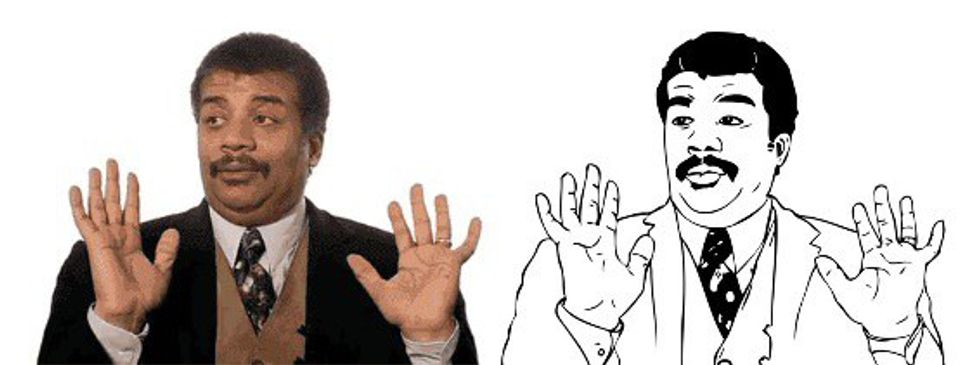 That's right, he's the "Lookout, we got a badass over here" guy. Or sometimes he's the "Black Science Man", or one of the other many memes created in his image. But it turns out he is a totally-for-reals astrophysicist, director of the Hayden Planetarium in New York City, and was the host/narrator/captain of the spaceship imagination on the second season of Cosmos (which you should totally watch if you haven't; it's on Netflix).