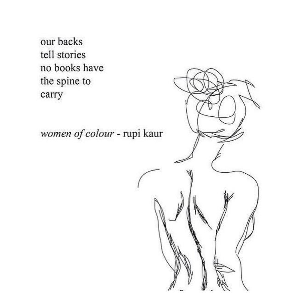 In this simple, one sentence poem, she speaks miles. Books are seen as strong, knowledge-filled objects that tell stories true and or false. These books can come in a variety of shapes and sizes, they can appear brand new, freshly taken off the printer, or they can appear deeply weathered and used. Kaur is using books as a comparison to women and how they can come in different shapes, sizes, and conditions but still remain strong, and in this case, stronger than books. The stories that are in these books is what makes them and that is the same with women. Carrying life experiences and stories around with a person for a lifetime can have its effects on a person, whether positive or negative, this poem reassures women that no matter what stories they might have and no matter what may have happened to them, they are stronger than they imagined.