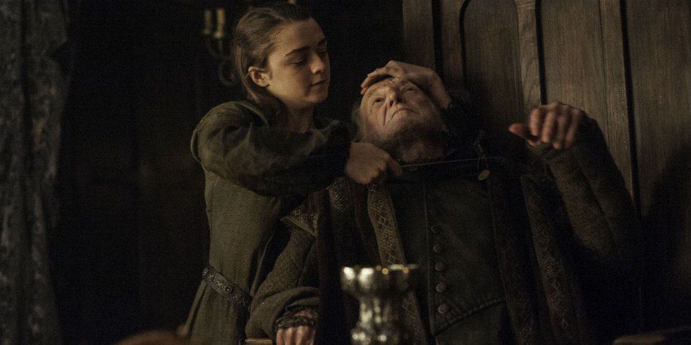 Red Wedding Vengeance!!! I LOVED when Arya slit Fray's throat, just like her mother's and brother's. I think that she will continue to find the people who wronged her, the ones that she recites before she goes to sleep every night, and kill them. I think she will go north again and find Baric and Hound alive. I have conflicting feelings about Arya and Hound's relationship, so half of me hopes that she teams up with him again for an ultimate duo.