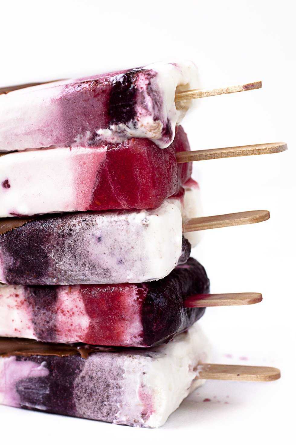 Like I said, you can do anything you want with these. One option is to put all your chosen ingredients into a blender so the pop has the same texture throughout. Another option is to pour the Greek yogurt into the mold and then the fruit to have bursts of fruit pieces. Or you can design your pops by sticking solely to Greek yogurt or solely to fruit. Some of my favorites are Peach Banana Pops, for which I combine fresh peaches, bananas, vanilla Greek yogurt, and a little vanilla extract and honey. I also like to make American Flag Pops, where I blend blueberries and strawberries separately, then pour them into the mold, alternating with vanilla Greek yogurt, so the pops look like American flags. Overall, these are the perfect sweet treats for any time of day.