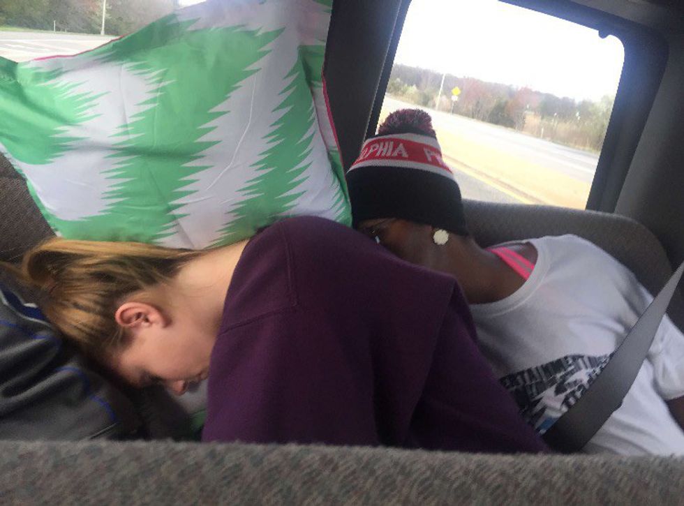 When you ride in a van with 15 other people, you get really close. Particularly after a game. Depending on if it was a tournament or a game of 40-minute halves, it takes a lot out of you and it makes you tired. You were being tackled, stepped on, and other things during this time and when you are headed back to school, all you want to do is sleep. Since there is only so much space on a van, when you fall, asleep you shift and end up with your head on someone's shoulder or on their back and it's perfectly fine.