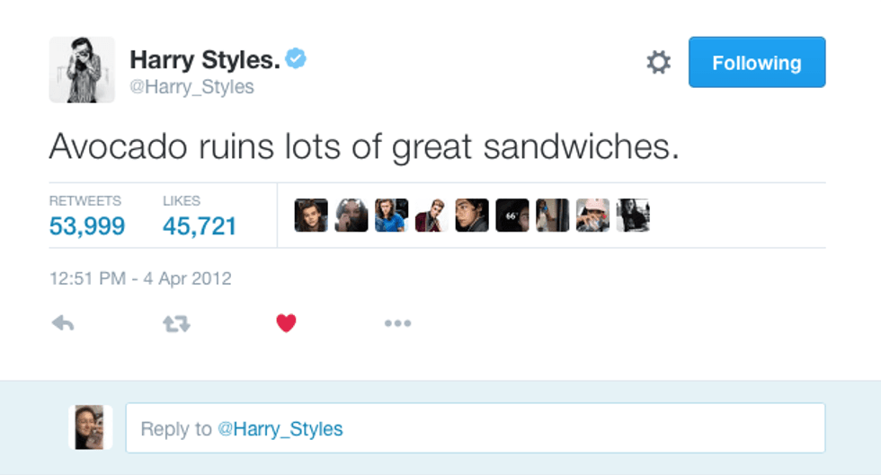 To anyone who's a fan of One Direction, it comes as no surprise that Harry Styles doesn't like avocados. He hates them, actually. This is why dear Harold and I are completely compatible -- you see, I love avocados. Those green little bundles of goodness would never be an issue in our relationship. Harry would take me out for a Saturday brunch somewhere quaint and romantic -- the perfect little cafe. We would sit out on the back patio under a trellace of roses. I would order a spring salad with two medium boiled eggs, Harry would choose a turkey croissan'wich, minus the avocado, with a side of banana. We would sip our coffee, enjoying each other's loving presence and the crisp morning air. We would talk with one other as if it were as easy as breathing, and there wouldn't be an issue when his food arrived, avocados and all, because he would look admiringly to me as he scooped the fresh slices onto a plate, passing it my way, laughing to himself at my profound love of avocados as I added them to my salad.