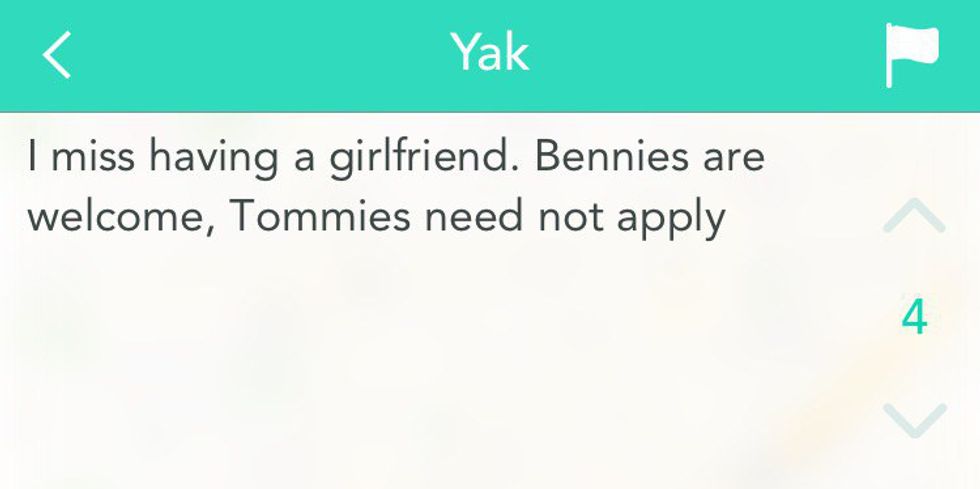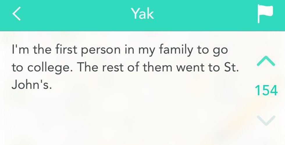 Rivalry jokes are the best in the book. Better yet, they are extremely abundant. All you have to do is go onto Yik Yak and begin reading. I've included my personal favorites from my own college and my best friend's (notice the diss yak toward St. John's received 150 more upvotes - one coming from myself).