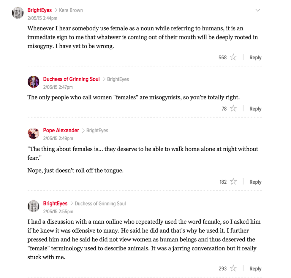 "I had to explain that when certain women hear a guy say "female" (and its even crasser euphemism, "b--ch"), it's akin to a black person hearing a nonblack person drop an n-bomb. There would be a whole lot of automatic assumptions made about what that nonblack person thinks about black people. Most would automatically call that person racist through and through, and yet guys don't want to accept that the language some use to refer to women has the same effect on women. "