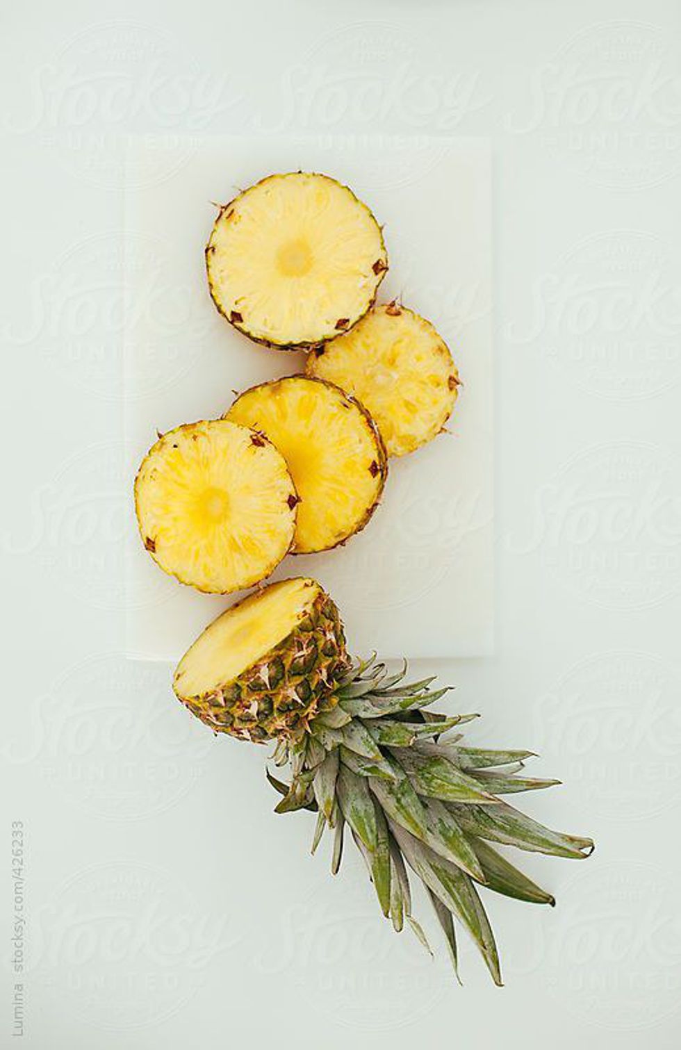 Pineapples contain a very important enzyme called bromelain, which is found in the stem and within the juice of the pineapple. This is enzyme is known to metabolize protein, which has a lot of health benefits and one of those include a flatter abdomen. Now pineapples don't magically take the fat away but paired with good exercise routines it does help burn them pounds away.