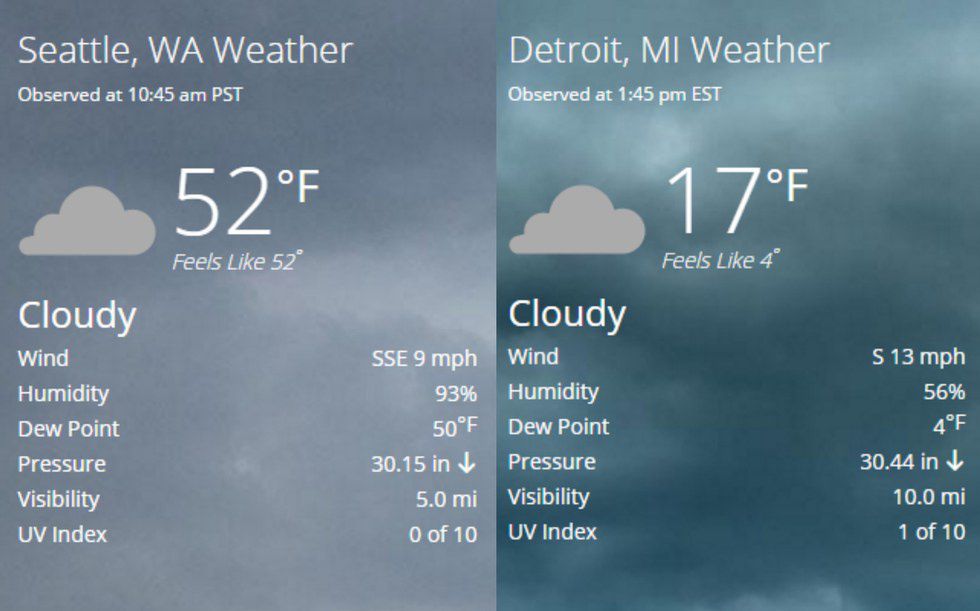 Maybe this is because I've lived in Michigan my whole life, but I have a very strong dislike for the cold and snow. Sure, it looks pretty from inside when it's falling, but that's the only good thing about it. Seattle averages only 6.8 inches of snow a year while Detroit averages 42.5. This fact alone is enough to convince me that Seattle is where I belong. However, if you need some more convincing, the average low temp for January in Detroit is a bone-chilling 19 degrees Fahrenheit while in Seattle, the average low temp for January is 37. Talk about a huge difference.