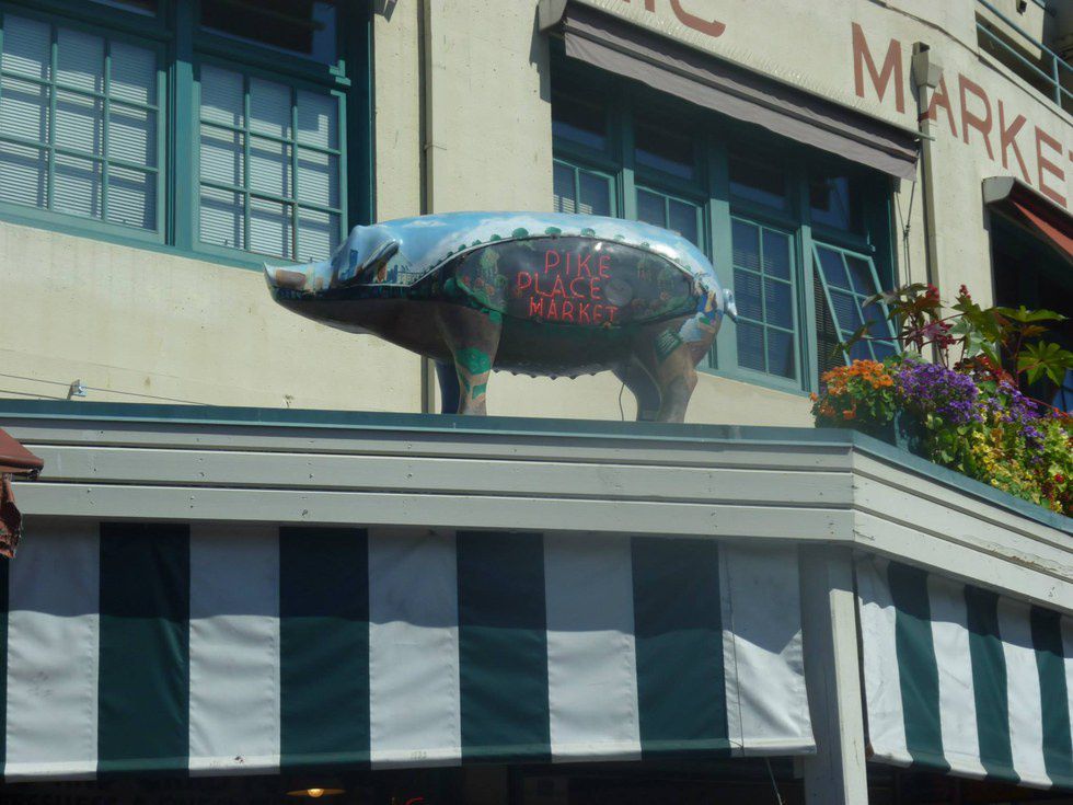 Pike place is a public market that overlooks Elliott Bay. There are many places to visit and see such as comic book shops, antique stores, street performers, collectible shops, fresh fruit stands, etc. A popular stop is the Pike Place Fish Market, where employees literally hurl three foot salmon through the air to each other. It's quite entertaining. Pike Place is also home to Rachel the Piggy bank, a literal 550 pound piggy bank that collects $6,000-$9,000 annually. Legend has it if you rub her snout before making a donation, you'll have good luck!